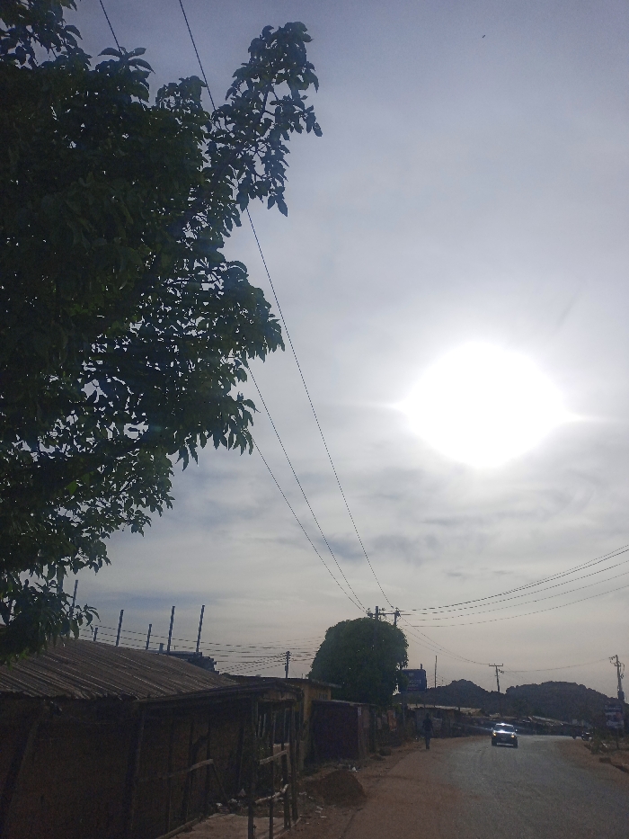 The image captures a bright, daytime street scene in Jos, Nigeria. The sky is hazy with a prominent, intensely bright sun positioned in the upper right, casting significant glare. In the upper left quadrant, dark green foliage from a tree branch partially obstructs the view. Multiple dark utility wires stretch diagonally across the sky from the top left towards the bottom right. Along the left side of a dark-paved road, a series of approximately five single-story, rudimentary structures with corrugated metal roofs and walls constructed from materials resembling mud, wood, or unfinished brick are visible. Some of these structures have exposed wooden frames or posts in front. Accumulations of dirt and debris are present along the unpaved shoulder of the road adjacent to these buildings. Further along the left side, several dark vertical poles, possibly scaffolding or support structures, stand against the sky. A single individual, seen from behind, walks on the left side of the road, moving away from the camera. On the right side of the road, a light-colored sedan with its headlights illuminated is driving towards the viewer. Multiple utility poles with crossarms and wires line the right side of the road, and a large, rounded tree stands behind them, partially obscuring a faded blue sign. In the background to the right, dark, undulating hilly terrain is visible against the horizon.