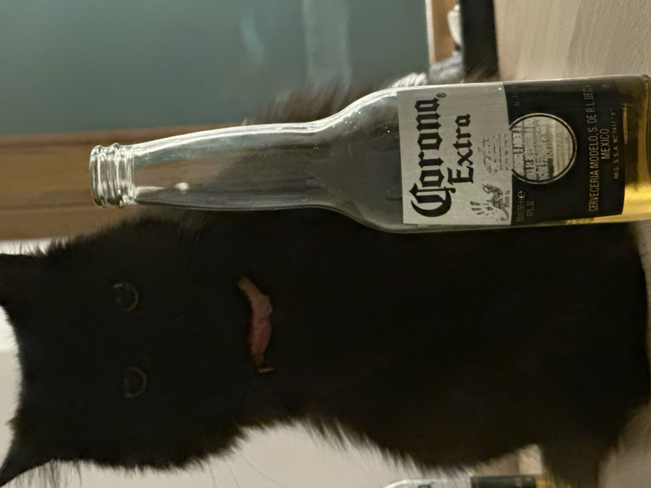 The scene is located in Sofia, Bulgaria. A black, long-haired cat with faint green/yellow eyes is positioned in the mid-ground, partially obscured by a clear glass Corona Extra beer bottle. The cat's mouth is slightly open, revealing a pink tongue protruding marginally and two small, pointed white fangs. The Corona Extra bottle, containing a light golden liquid and appearing nearly full, stands in the foreground, slightly to the right of center. Its label, detailing "Corona Extra," "CERVECERIA MODELO, S. DE R.L. DE C.V. MEXICO," and "REG. S.S.A. No 7417 "B"," is clearly legible. A portion of a second, similar bottle is visible on the far left edge of the frame. All subjects rest on a flat, light-brown surface exhibiting a wood grain texture. The background immediately behind the cat is a plain, light-colored wall, transitioning to a darker, possibly wooden, vertical surface and a segment of a teal-colored wall further to the right.