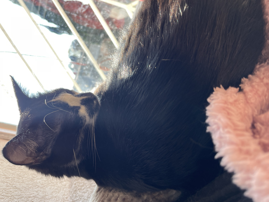 A domestic cat is observed in profile, situated indoors near a window in San Sebastián de Aparicio, Mexico. The cat exhibits predominantly black fur, with distinctive white and tan patches on its face, specifically around the eyes and muzzle. Its left ear is visible, erect, while the right is partially obscured. Direct sunlight illuminates the animal's dorsal fur, causing individual guard hairs to glint. The cat appears to be resting or looking intently towards the bright outdoor environment visible through a window featuring horizontal security bars. A soft, pink, textured material, possibly a blanket or cushion, is partially visible in the lower foreground, indicating the cat's resting surface. No human subjects are present.