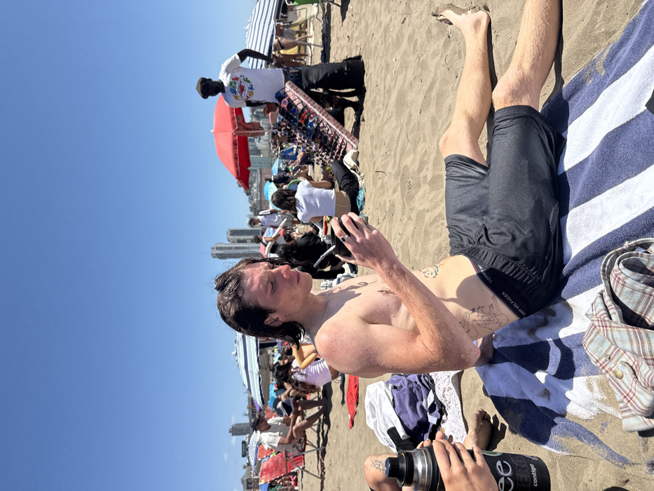 A man in black shorts lies on a striped towel at a crowded beach. He is shirtless and holds a phone. A tattoo is visible on his torso. Other people are relaxing on the beach, some under umbrellas. A man in a white shirt stands with a rack of merchandise. Buildings can be seen in the background. A water bottle is visible in the foreground. The scene is sunlit.