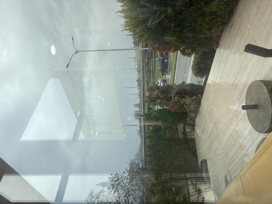 The image captures an exterior urban scene viewed through a large, reflective glass window from within a building. The sky is overcast, and exterior surfaces appear wet, indicating recent precipitation. **Interior Reflections (Foreground):** The window glass shows significant reflections of the building's interior, including white ceiling panels with circular recessed light fixtures and structural elements like beams or columns. A yellow surface, likely a table or counter, is visible along the bottom edge of the frame. **Exterior Environment (Midground):** Immediately outside the window is a light-colored, plank-patterned tiled patio, visibly wet. On the patio, positioned centrally in the lower frame, is a dark gray circular concrete base with a central vertical metal pole, consistent with a parasol stand. To its right, a dark, angled object, possibly part of a chair or furniture, is partially visible. Beyond the patio, a landscaped area features a dense row of dark green evergreen shrubs. To the left, several deciduous trees with bare branches are present. **Urban Landscape (Background):** A wet asphalt road traverses the mid-ground, with a dark-colored SUV or crossover visible parked or slowly moving on the right side. Other vehicles are less distinctly visible along the road. Dominating the background is a long, elevated concrete bridge or overpass, supported by multiple pillars and carrying several lanes of traffic. Vehicles, including a white bus, are present on the bridge. Modern streetlights with double arms are positioned along the road and the bridge. Distant urban structures are faintly visible beneath the heavy cloud cover beyond the bridge. **Location:** This scene is located in Plovdiv, Bulgaria. The prominent elevated structure is the overpass carrying **Boulevard "Sankt Peterburg"** (Saint Petersburg) over the railway lines and adjacent areas. The vantage point is likely from a commercial establishment situated along this boulevard, with the view generally oriented towards the east-southeast, observing the overpass and surrounding infrastructure.