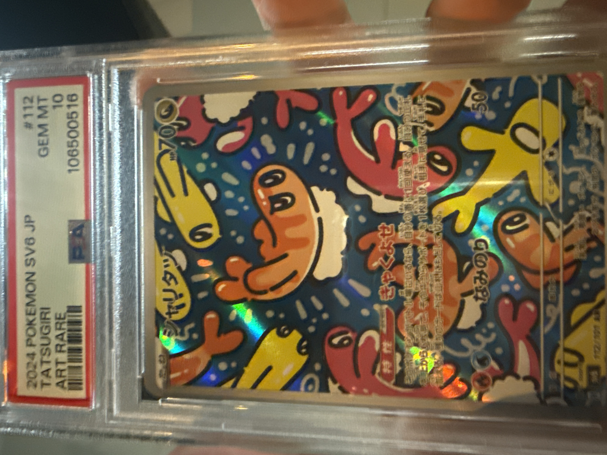 A close-up image displays a Professional Sports Authenticator (PSA) graded Pokémon trading card held vertically by human fingers against an indistinct, dark background. The card is encased within a transparent plastic slab. The top label on the slab reads "2024 POKEMON SV6 JP," "TATSUGIRI," and "ART RARE" with a barcode on the left. On the right, the label displays "#112," "GEM MT," "10," and the certification number "106500516." The card itself features multiple stylized, cartoon-like figures resembling sushi or shrimp in orange, yellow, red, and pink hues, set against a dark blue background dotted with white and light blue elements. The card exhibits holographic effects, visible as iridescent glints across its surface. Japanese text is prominent at the top and various sections of the card, along with numerical values "HP 70" at the top right of the art, and "50" near the bottom right. The card number "112/101 AR" is discernible at the bottom left. Portions of human thumbs and fingers are visible on the left and right edges of the slab, providing support. This scene is located in Mexico City, Mexico.