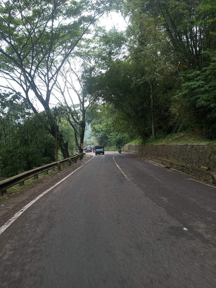 A road curves slightly, lined with trees and a low stone wall on one side and a metal guardrail on the other. Several vehicles are visible in the distance, including a dark SUV and a motorcycle. The road surface is dark asphalt with a yellow line dividing the lanes. Lush green vegetation covers the hillside and overhanging branches form a partial canopy above the road. The sky appears overcast.
