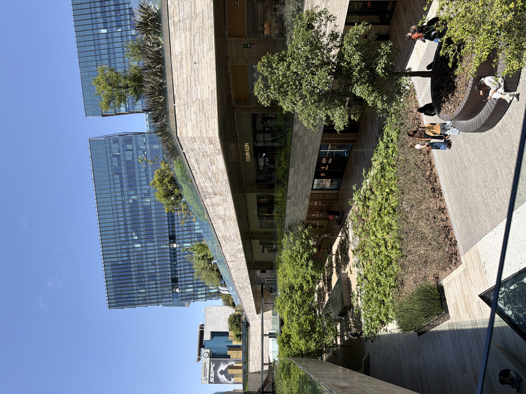 An elevated, oblique view captures a modern commercial area in Mexico City, Mexico. Two glass-facade skyscrapers stand against a clear blue sky. A multi-level building constructed of horizontal slabs of beige stone forms an adjacent structure that likely contains shops and businesses. A ‘Calvin Klein’ storefront is visible. Manicured greenery, including trees and shrubs, is integrated into the architecture, adding a natural element to the urban setting. Below, a pedestrian area features a paved walkway, a circular bench surrounding a tree, and people leisurely interacting in the space. Some individuals are seated on the bench, while others are walking along the path. A sign for SSPC is seen. The overall impression is one of a modern, upscale urban environment designed for commerce and leisure.