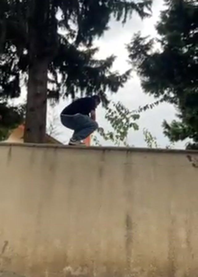 - ". A person is crouched on a wall outdoors. The person is wearing a black shirt and blue jeans. Behind the person are tall trees and some bushes. The wall is a light beige color. The sky is overcast. The person stands up." by FM-QWs9h1, licensed under CC BY 4.0