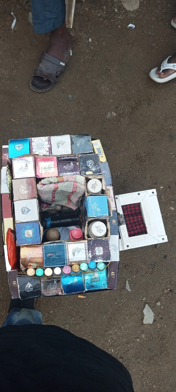 The image presents an overhead view of a makeshift retail display on an unpaved, dirt surface in Adankolo, Nigeria
