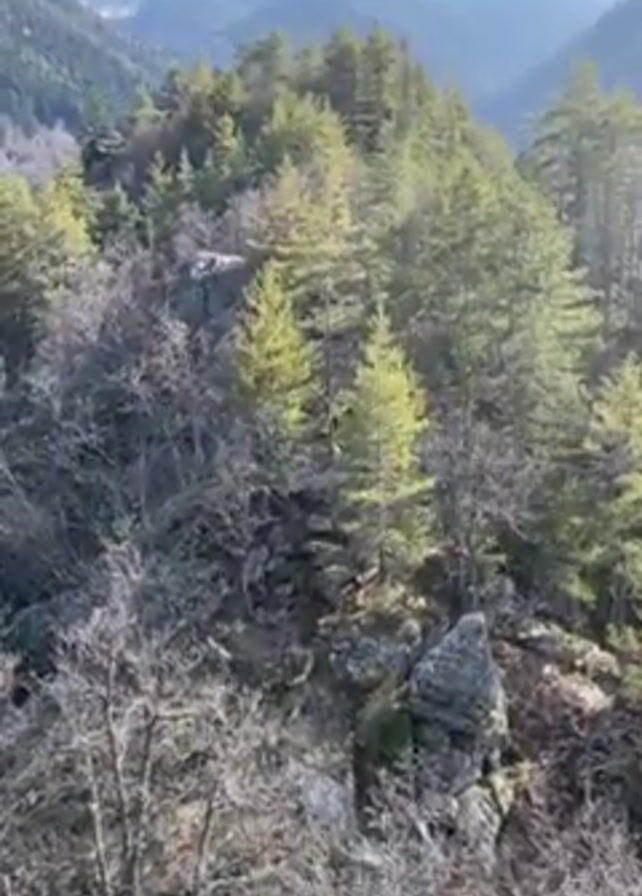 mountainous landscape with coniferous trees and rocks. The sky is blue with some clouds. The camera pans upwards to reveal more of the mountain range in the background. The scene appears to be in a natural, outdoor setting.