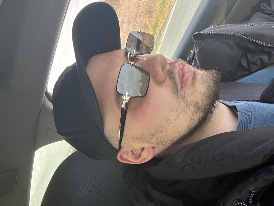 The image depicts a male individual seated inside a vehicle, viewed from a slightly elevated side-profile