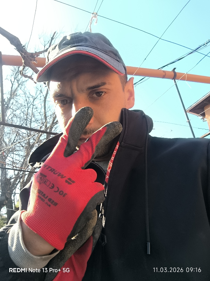 A male individual is depicted in a close-up selfie, facing the camera with a direct gaze. He wears a dark grey baseball cap with a red trim on the brim, a black hooded jacket, and a light-colored undershirt cuff visible on his left wrist. His left hand, covered by a red work glove with black textured palms and fingertips, is raised to partially obscure the lower portion of his face, with two fingers splayed in a V-shape. The glove features white text including "M.TR.R", "RED LINE", "CE", and other symbols. The background reveals an outdoor setting under a clear blue sky. Overhead, a brown PVC pipe is secured horizontally with white zip ties, supporting several thin black electrical or communication wires. To the left, a section of an old, gnarled vine is visible, along with bare tree branches, suggesting a dormant season. A partial view of a light-colored building structure is present in the upper right. The image was captured in Dolni Dabnik, Bulgaria, on March 11, 2026, at 09:16. The photograph was taken with a REDMI Note 13 Pro+ 5G device.