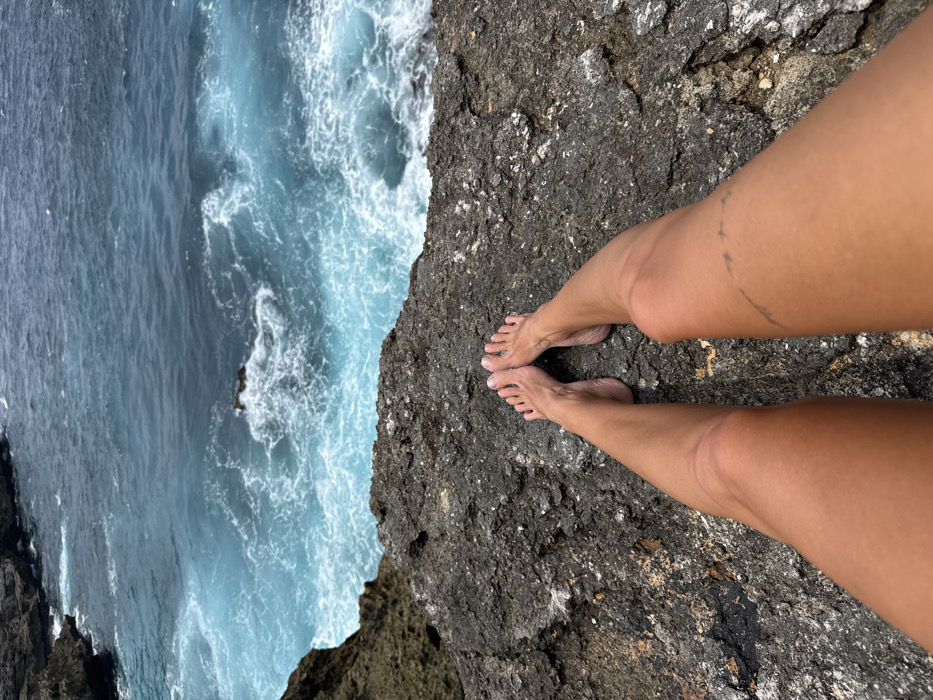 A person's legs stand on a rocky ledge overlooking turbulent ocean. The legs are tanned, with bare feet resting close to the edge. A faint tattoo is visible on one leg. The ocean's surface is a blend of deep blues and frothy white where waves crash. The rock is dark, textured, and appears coarse, providing a stark contrast to the smooth skin.