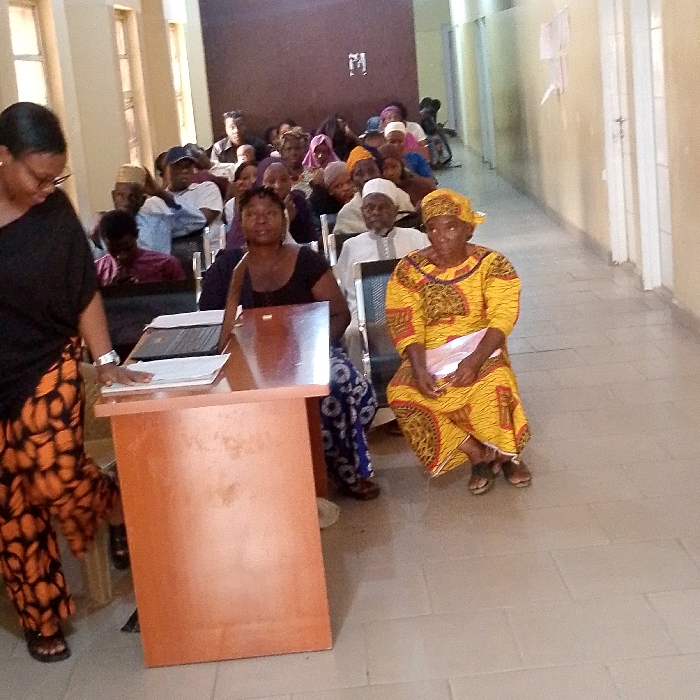 The image depicts an indoor gathering within what appears to be a public or institutional building in Lokoja, Nigeria. Approximately 25-30 individuals, predominantly adults, are present. In the foreground, a woman in a black short-sleeved top and orange and black patterned trousers stands to the left, leaning over a light brown wooden desk. Papers and a partially open laptop are visible on the desk's surface. Directly behind the desk, a woman in a black top and blue patterned skirt is seated, looking forward. To her immediate right, an older man in a white tunic and cap is seated. Further to the right, an older woman in a vibrant yellow and orange patterned dress is seated, holding a light-colored document or cloth. The majority of other individuals are seated in multiple rows extending into the background, generally facing towards the foreground. Their attire varies, including traditional Nigerian clothing and casual wear. The environment features light-colored tiled flooring and walls, with the right wall being light yellow/beige and displaying a doorframe and some affixed papers. The back wall is a darker brown/maroon with a centrally located framed object. Natural light enters from windows visible at the far end of the room or hallway, supplementing interior lighting.