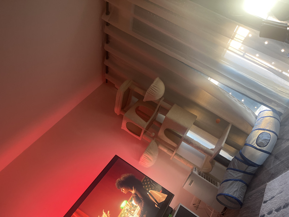 The image depicts an indoor residential scene, identified as being in Le Puy-en-Velay, France, illuminated by a prominent red ambient light source, likely an LED fixture, casting a reddish hue across the ceiling and upper wall. On the left side of the frame, a large flat-screen television displays a female figure with dark, curly hair, viewed in profile, seated and looking upwards. Below the television, a white, vertical appliance, possibly an air purifier or humidifier, stands on a media console. Centered in the room is a tall, multi-level cat tree, beige in color, featuring various platforms, scratching posts, and two elevated, bowl-shaped resting areas. An orange ball rests on one of the lower platforms of the cat tree. On the floor directly in front of the cat tree, a collapsible pet tunnel, blue and grey with multiple openings, is extended. A light-colored wooden or laminate floor is visible, with a section of a grey rug in the bottom left foreground. To the right, a large window, covered by sheer white grommet-top curtains, allows bright natural light to enter, creating a significant glare in the lower right corner. The overall environment appears tidy. No human figures are present within the physical space depicted in the room.