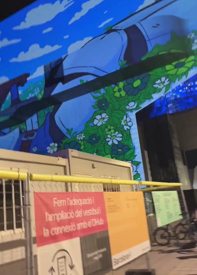 night-time scene in what appears to be an urban area in Barcelona, Spain. A large building, illuminated with blue and red lights, is visible in the background. The building is known as Torre Glòries, or the Agbar Tower. In the foreground, there is a construction site with barriers, signs, and construction equipment. A colorful anime style art installation is projected on the building behind the construction area. People are walking near the construction area and under the art installation. The camera pans and slightly shakes while recording, giving the impression of someone walking while filming. The video also shows the Metro sign at a distance.