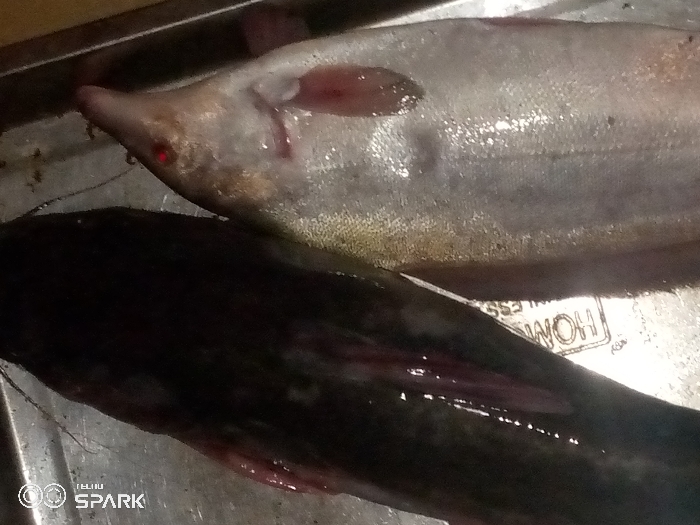 Two dead fish lie side by side on a metallic surface. The fish on top is silver-colored with a slender, elongated body and a pointed head. The bottom fish is dark, possibly a catfish, with visible whiskers and fins. The surface underneath appears to be a tray or countertop. The scene is dimly lit. The text "TECNO SPARK" is located at the bottom left of the frame.