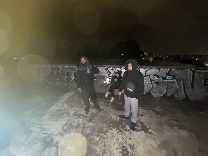The image captures three individuals at night on an elevated concrete surface in the Gerakas Municipal Unit, Greece. A male with a beard stands on the left, wearing a dark hooded jacket with a grey upper portion and dark pants, presenting a thumbs-up gesture with his right hand. A second male stands in the right foreground, wearing a black hooded sweatshirt with the hood up, light grey sweatpants, and a black Adidas shoulder bag. A third individual, partially obscured behind the second male and seated on a low concrete structure, is looking down at a small illuminated device. Behind the subjects is a concrete wall heavily covered in dark-colored graffiti. Beyond the wall, a distant city landscape with scattered lights is visible under a dark sky. The ground is a textured, discolored concrete surface. Circular lens flare artifacts are prominent in the upper left and lower central areas of the image.