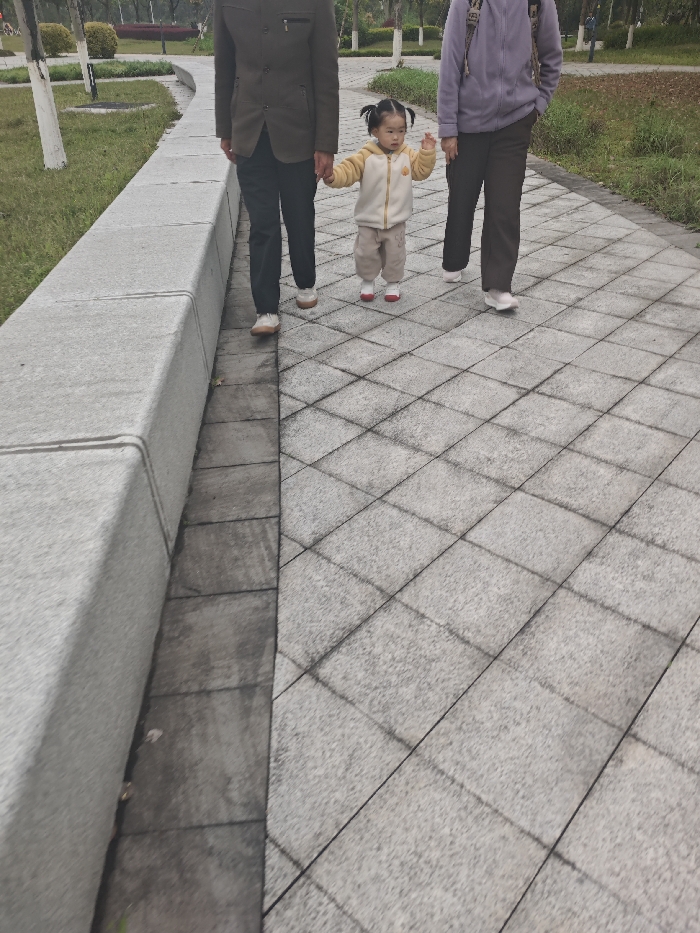 Three individuals are depicted walking on a paved pathway in an outdoor green space within the Chongqing High-tech Zone, China. The pathway consists of light grey square tiles arranged diagonally, bordered on the left by a narrow strip of darker grey rectangular paving stones. Adjacent to this border is a low, light grey stone wall. To the left of the wall and in the background, green grass, bushes, and trees with pale trunks are visible. A toddler, positioned in the center, has dark hair styled in two pigtails and wears a cream-colored zippered jacket, light brown trousers, and shoes with red soles. The child holds the left hand of an adult to their left and the right hand of an adult to their right. The adult on the left, visible from the chest down, wears a dark olive-green collared jacket, dark trousers, and light brown flat shoes. The adult on the right, also visible from the chest down, wears a light purple hooded jacket with a visible backpack, dark brown trousers, and white flat shoes. All three individuals are in motion, walking forward. The lighting suggests an overcast sky.