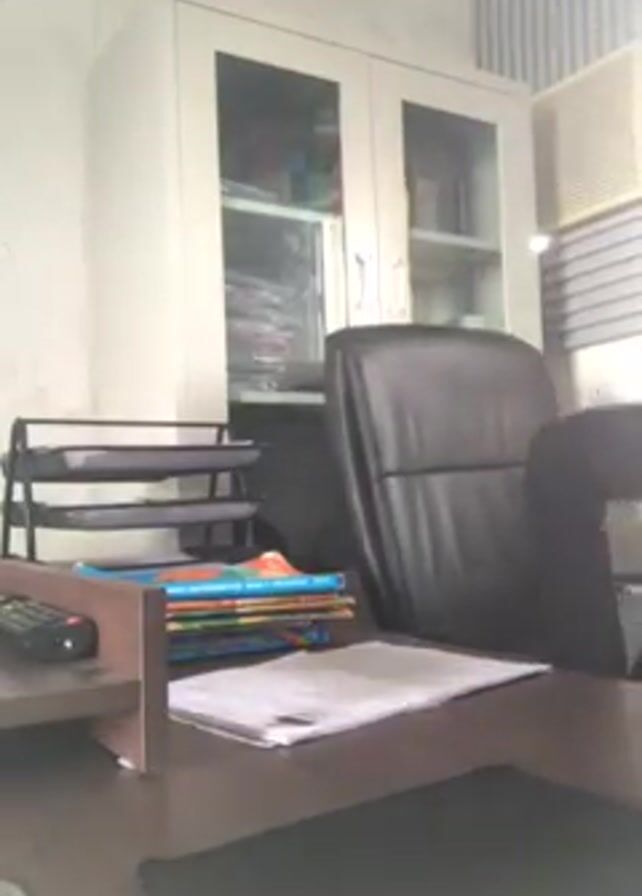 A young woman sits down in a black leather office chair at a desk in a small office. The desk has a dark wooden top, a remote control, a three-tier shelf of documents, and a stack of books on the left side of the desk. There is a document spread out on the desk, and a black pad on the right. Behind her is a large white cabinet with glass doors, and an air conditioning unit is visible on the right. The walls are painted white with vertical beige stripes. She wears a black blazer and dark pants. She faces the camera and begins to speak.