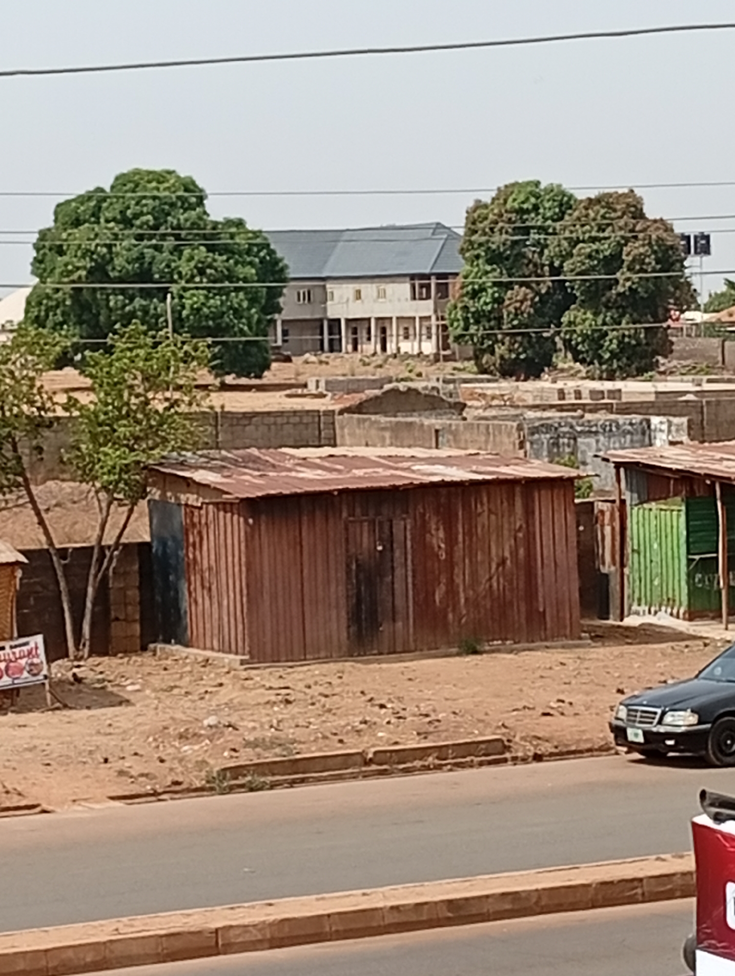 The scene depicts an outdoor environment in Sabon Tasha, Nigeria, under a bright, possibly hazy sky. The foreground features an asphalt road with a raised tan concrete curb. A partial view of a dark sedan, consistent with a Mercedes-Benz, is visible on the right side of the road, facing left. An incomplete red and white object, possibly a mobile vendor cart, is at the extreme right. The midground consists of exposed, reddish-brown earth, uneven and sparsely covered with dry vegetation and scattered debris. Centrally located is a rectangular structure constructed from heavily rusted corrugated metal panels, topped with a matching rusted corrugated metal roof. A single dark, wooden door is visible on its front face. To the immediate right, a smaller structure, partially visible, is composed of green corrugated metal. To the left of the central rusted structure, a small, multi-stemmed tree with light green leaves stands. Further left, a sign displaying the word "Restaurant" in white text on a red background is partially visible. Behind these structures, the terrain rises slightly, revealing multiple concrete block walls or foundations. The background is dominated by two large, dense green trees, flanking a multi-story building. This building features a light-colored facade and a dark roof, displaying multiple windows. Overhead, several utility lines traverse the upper portion of the image. No individuals are present, and no actions or interactions are occurring.