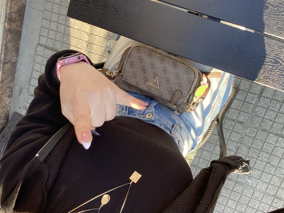 An overhead perspective photograph depicts an individual seated outdoors in what appears to be Gabrovo, Bulgaria. The subject wears a black long-sleeved top or jacket with a visible zipper along the left chest area and light-wash blue denim jeans. Two gold-toned necklaces, one with a teardrop pendant and another with a rectangular engraved pendant, are visible against the black top. The subject's right hand, with fingernails manicured in a French-tip style, is positioned in a "thumbs down" gesture. A pink watch with a metallic clasp is worn on the right wrist. Resting on the subject's lap is a small, brown "Guess" brand purse or wallet, featuring a repeating monogram pattern and a prominent gold-colored triangular logo plate. A small, bright green charm is attached to the purse. To the right, a dark, textured outdoor table surface is partially visible. The ground beneath the subject consists of light-colored square paving stones. The scene is illuminated by direct sunlight, casting distinct shadows. The specific location within Gabrovo is not identifiable from the visual content.