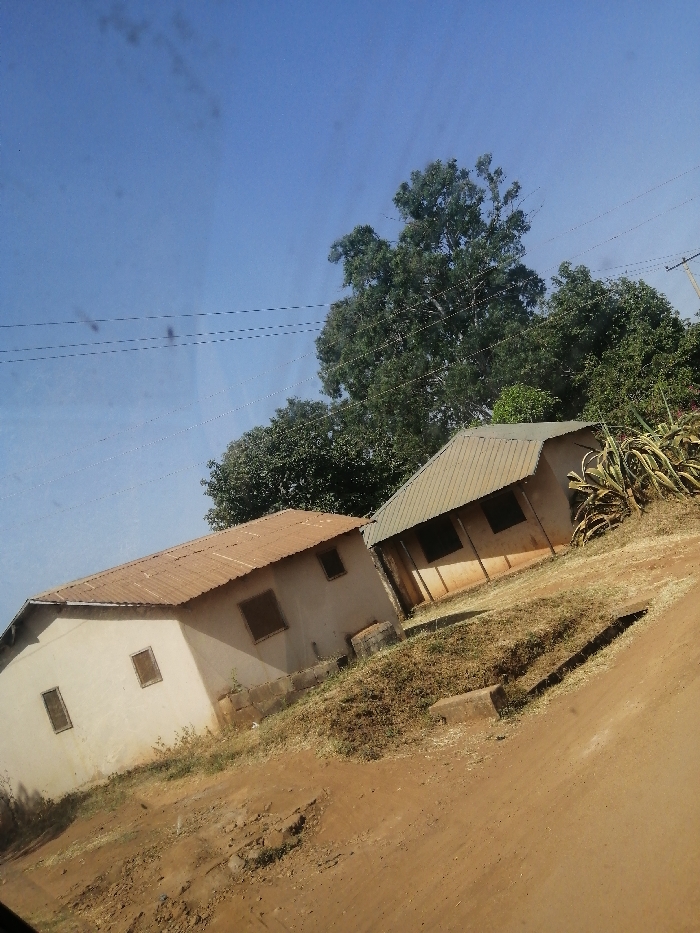 Two single-story buildings sit on a dirt landscape under a bright blue sky. The building on the left has a reddish-brown metal roof and off-white walls, featuring three small windows. The building on the right has a similar structure but with a gray metal roof and two larger windows. Lush green trees form a backdrop, and utility poles are visible in the distance. The ground is covered in dry grass and dirt, with a small concrete structure in the foreground.