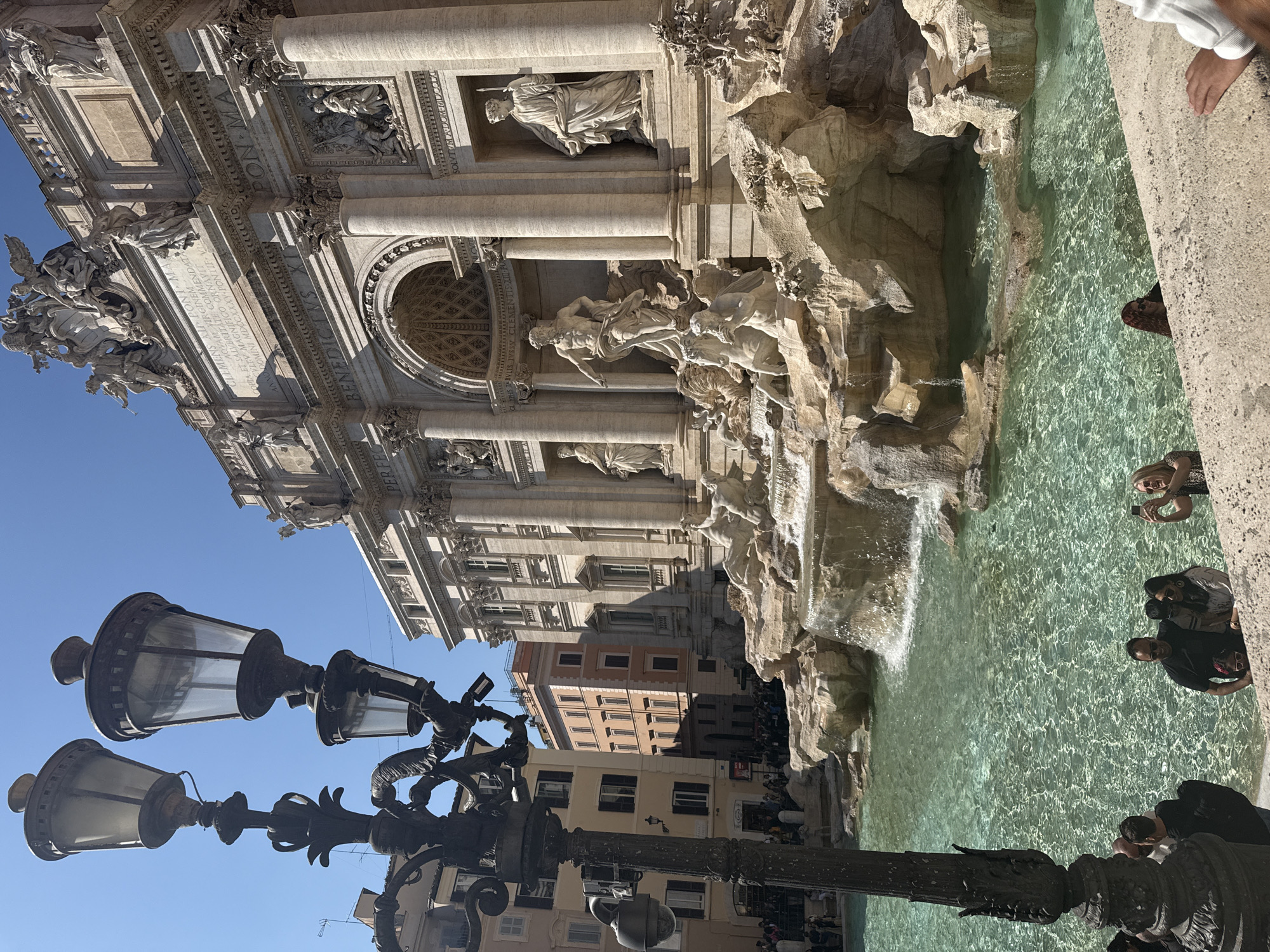 The image depicts the Trevi Fountain in Rome, Italy, under a clear blue sky with bright sunlight. The central feature is the grand Baroque fountain, constructed primarily from white marble. Its intricate facade features large Corinthian columns, niches containing allegorical statues, and a prominent central arch. The primary statuary depicts Oceanus (often identified as Neptune) standing on a shell-shaped chariot, pulled by two tritons guiding a tame and a wild hippocampi, emerging from artificial rock formations. Water cascades from multiple points over these rocks into a large, shallow basin filled with clear, turquoise-colored water. Inscriptions and additional statues, including winged figures and allegorical representations, adorn the upper architectural elements of the fountain. In the foreground, a tall, ornate black metal street lamp with three glass lanterns is positioned on the left, partially obscuring the view of the fountain and background buildings. Below the lamppost, a visible security camera is mounted. A light-colored concrete ledge or barrier forms the immediate lower edge of the frame. Numerous individuals are gathered around the fountain. In the immediate foreground on the right, a woman with blonde hair is holding a smartphone to take a picture of the fountain. A group of three adults and one child are observing the fountain from the concrete ledge, with another woman having red hair visible near the water's edge to the right. A larger crowd of people is visible in the background street to the left of the fountain. Surrounding buildings, multi-story and residential in appearance with windows and shutters, are visible behind the fountain and in the left background.