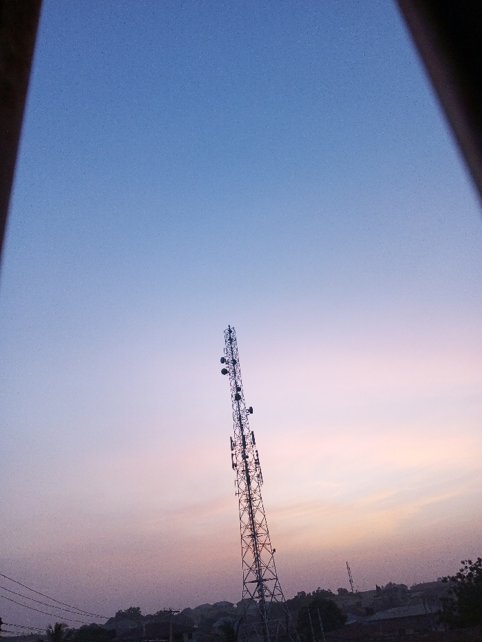 A tall communications tower stands against a blue and pink sky at sunset. The tower, made of a metal lattice, is equipped with various antennas and satellite dishes. Below the tower are dark silhouettes of trees and buildings. A power line runs along the left. The view is slightly obstructed by dark shapes at the top and left, creating a framed composition.