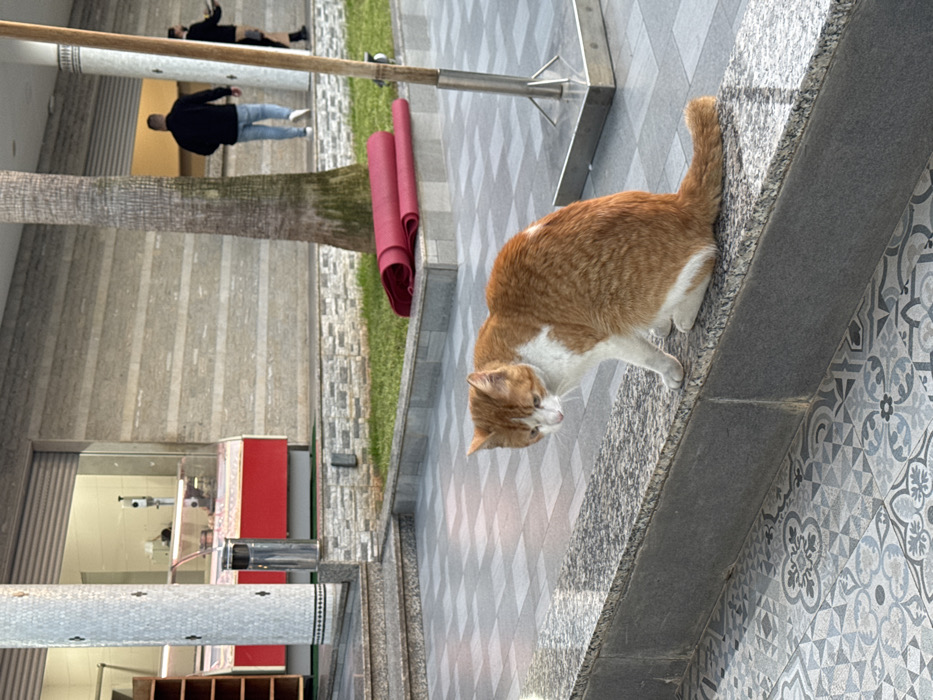 An orange and white cat stands on a ledge with patterned tiles. The ledge is bordered by a gray stone edge. A rolled-up red mat and a palm tree trunk are nearby. In the background, people can be seen near a building with a red and white storefront. The scene is outdoors on a sunny day.