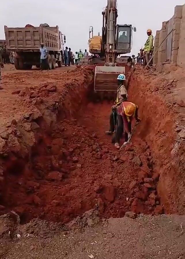 The scene shows an excavator and construction workers digging a trench in reddish dirt