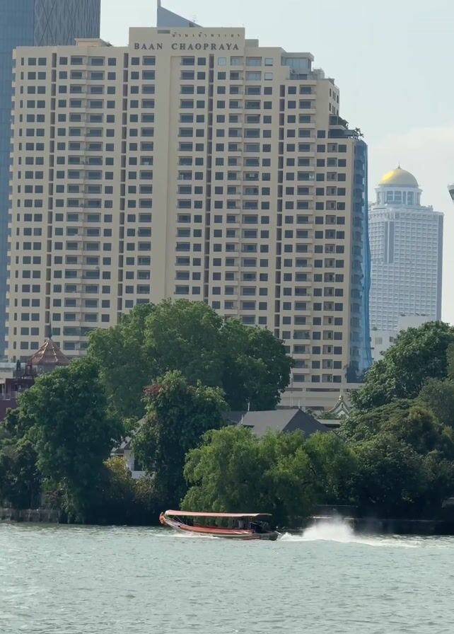 speedboat traversing a river against a backdrop of modern architecture and lush greenery. The "Baan Chao Phraya" building is prominently displayed, and other buildings and trees add to the urban and natural mix of the scene. The speedboat is moving swiftly, as evident by the trail of white water it leaves behind, while the sky is overcast.
