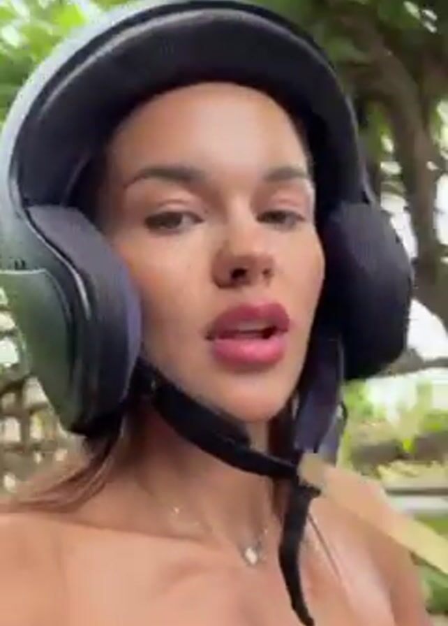 A fair-skinned woman wearing a black motorcycle helmet and a brown strapless top is recording a video