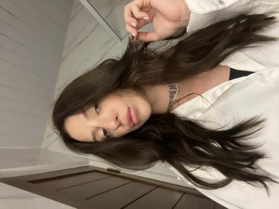 A young woman with long, wavy brown hair reclines, looking at the camera