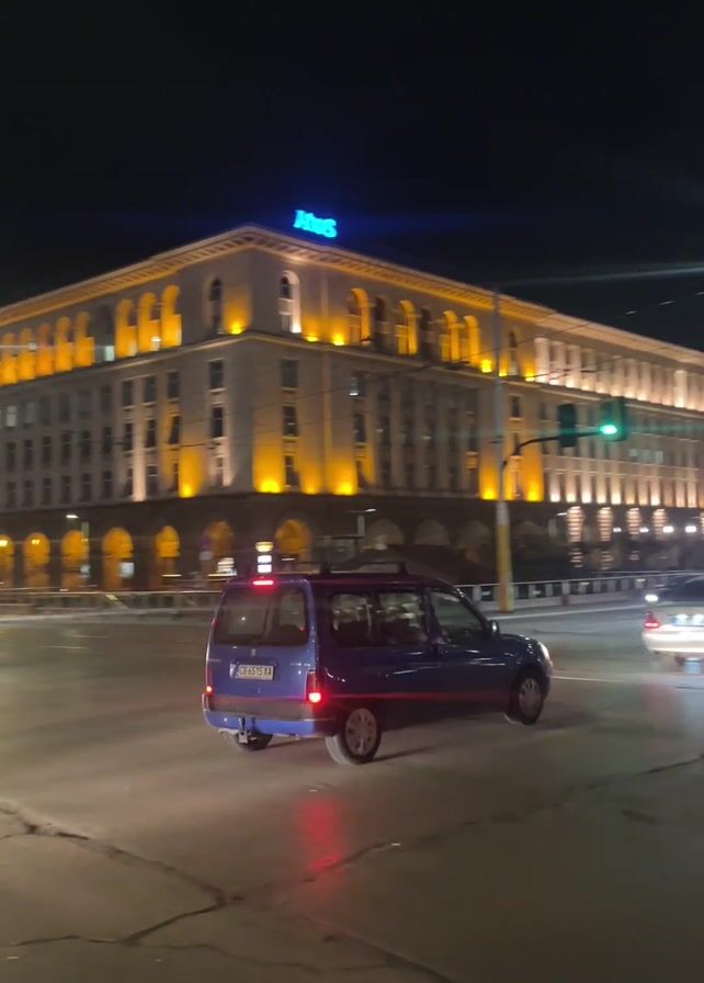 At night, a camera captures a street view in Sofia, Bulgaria, featuring the Largo complex illuminated with warm lights