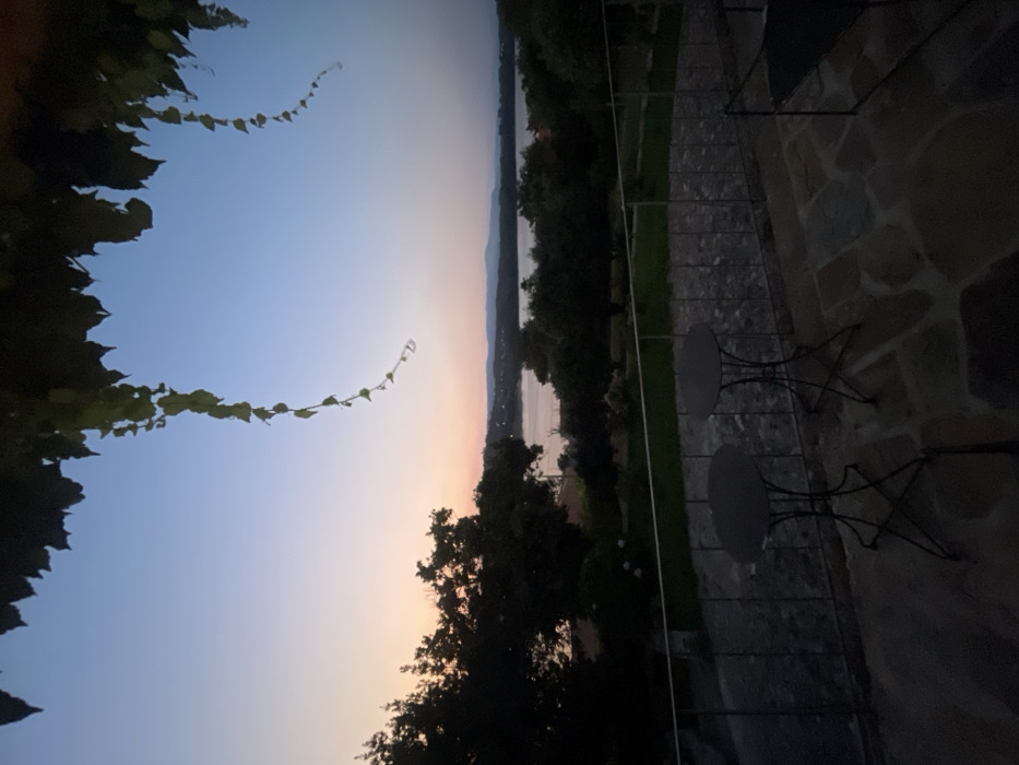 This image captures an outdoor twilight scene, likely at sunset or dusk, from an elevated perspective in Vila Nova de Cerveira, Portugal, overlooking the Minho River. In the immediate foreground, a dark stone patio is visible, featuring two dark, unoccupied round metal bistro tables with ornate bases. A dark, low metal railing extends horizontally across the mid-foreground, separating the patio from a landscaped area below. Beyond the railing, a strip of green lawn gives way to a dense band of dark, silhouetted trees and vegetation that line the edge of a wide, calm body of water, identified as the Minho River, reflecting the dim light. Across the river, a distant landmass composed of dark, rolling hills is visible, marked by a faint horizontal line of small, illuminated structures or lights, indicating a distant settlement. The sky transitions from a soft blue at the top of the frame to a warm gradient of orange and pink near the horizon where the sun has set. Overhead, dark, dense foliage with several hanging green vines extends down into the upper portion of the frame. No individuals are present in the scene, and no actions or interactions are depicted.