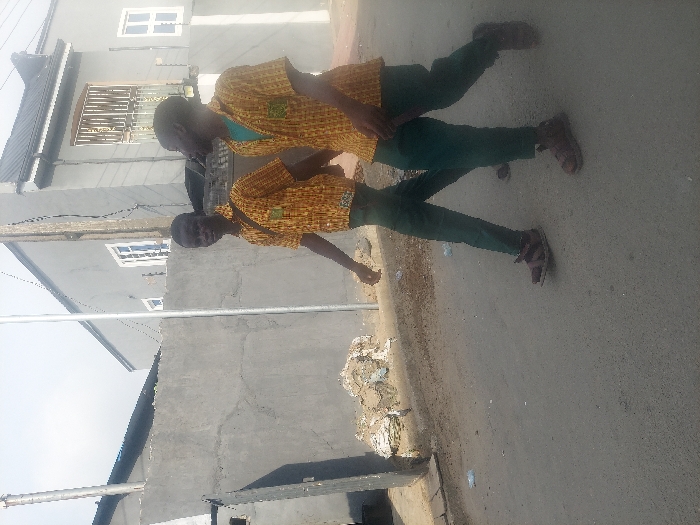 Two boys stand on a street in front of a light gray building. Both wear matching school uniforms of yellow and green. The building has windows with bars. Trash is scattered near the base of a gray wall. The street is an asphalt surface. The image's orientation is rotated, with the top angled towards the right.