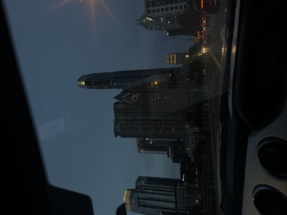 A night cityscape, observed from inside a car. High-rise buildings dominate the view, their lights illuminating the twilight sky. A road stretches between the buildings, dotted with vehicle lights. The dashboard of the car is visible, including air vents and reflective surfaces. The scene is captured from a slightly tilted perspective.