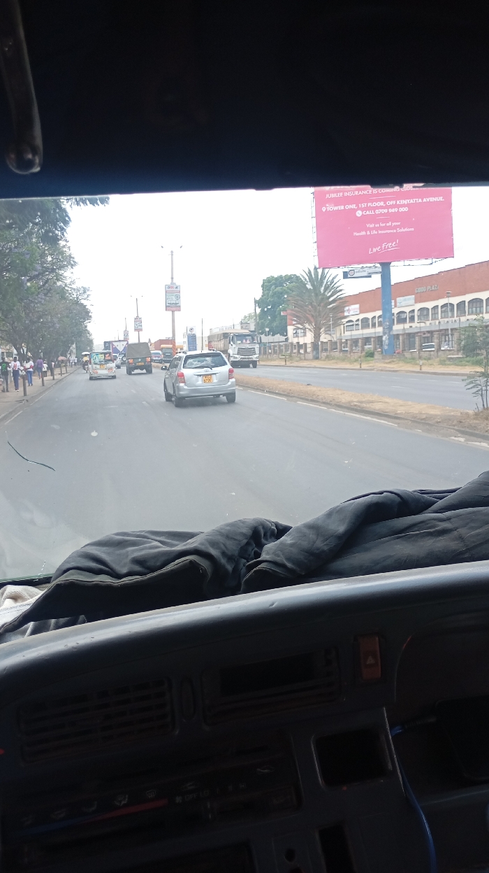 view from inside a vehicle, presumably a truck, driving on a road. Other vehicles, including a silver hatchback with license plate KYC 177R, are visible on the road ahead. On the right side of the road, a large pink billboard advertises Jubilee Insurance, located at 9 Tower One, 1st Floor, off Kenyatta Avenue, with a phone number and the tagline "Live Free!". Buildings and trees line the side of the road. The interior of the vehicle is visible in the foreground, including the dashboard and a dark-colored cloth.