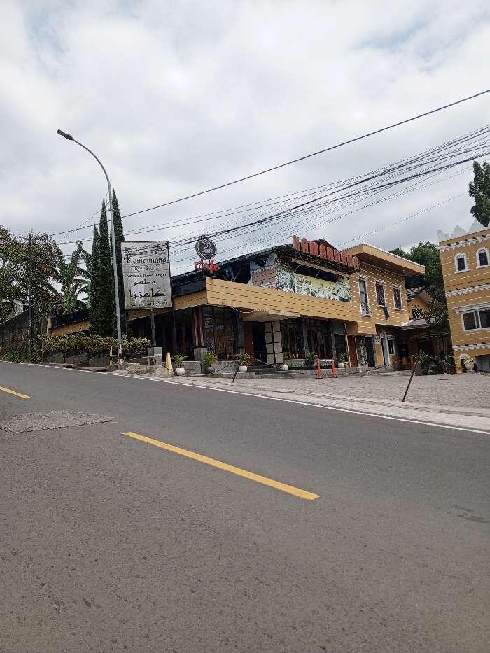 An outdoor street-level view in Cisarua, Indonesia, depicts a commercial area under an overcast sky. The foreground features an asphalt road with a single broken yellow lane divider line. A circular asphalt patch is visible on the road surface to the left of the yellow line. The road appears to incline slightly uphill from left to right. To the left of the road, a tall, gray street light pole with a curved arm stands erect, flanked by two slender, tall evergreen trees. Behind these trees and extending along the left side of the frame, dense green foliage is visible. The midground is dominated by a series of multi-story buildings. The most prominent structure is "Kamannana Restaurant," a light beige/tan building featuring large, dark-framed glass windows and doors on its ground floor. The upper facade displays decorative murals or large posters. A red sign spelling "KAMANNANA" is mounted on the roofline, with a smaller "Cafe" sign and coffee cup logo visible below it. A freestanding white sign in front of the restaurant details "Kamannana Resto & Cafe," "Kawasan Timur Tengah," and Arabic script. Potted plants are positioned near the building's entrance, and two orange traffic cones are visible on the paved area to its right. Immediately adjacent to the right of Kamannana, another light beige/tan building with multiple windows is present. Further to the right, a distinctive, lighter yellow building with a castellated roofline and arched windows is partially visible, exhibiting a Middle Eastern architectural style. Numerous overhead power lines and utility cables crisscross the sky above the buildings. No individuals or discernible activities are observed within the scene. The sky is largely obscured by scattered gray clouds.