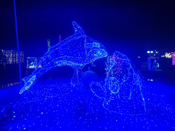A nighttime scene depicts illuminated figures: a dolphin seemingly touching noses with a human figure. Both are outlined by many small blue lights. A circular object sits between them. In the background, more illuminated structures and street lights can be seen, adding to the festive atmosphere. A pole is visible on the left.