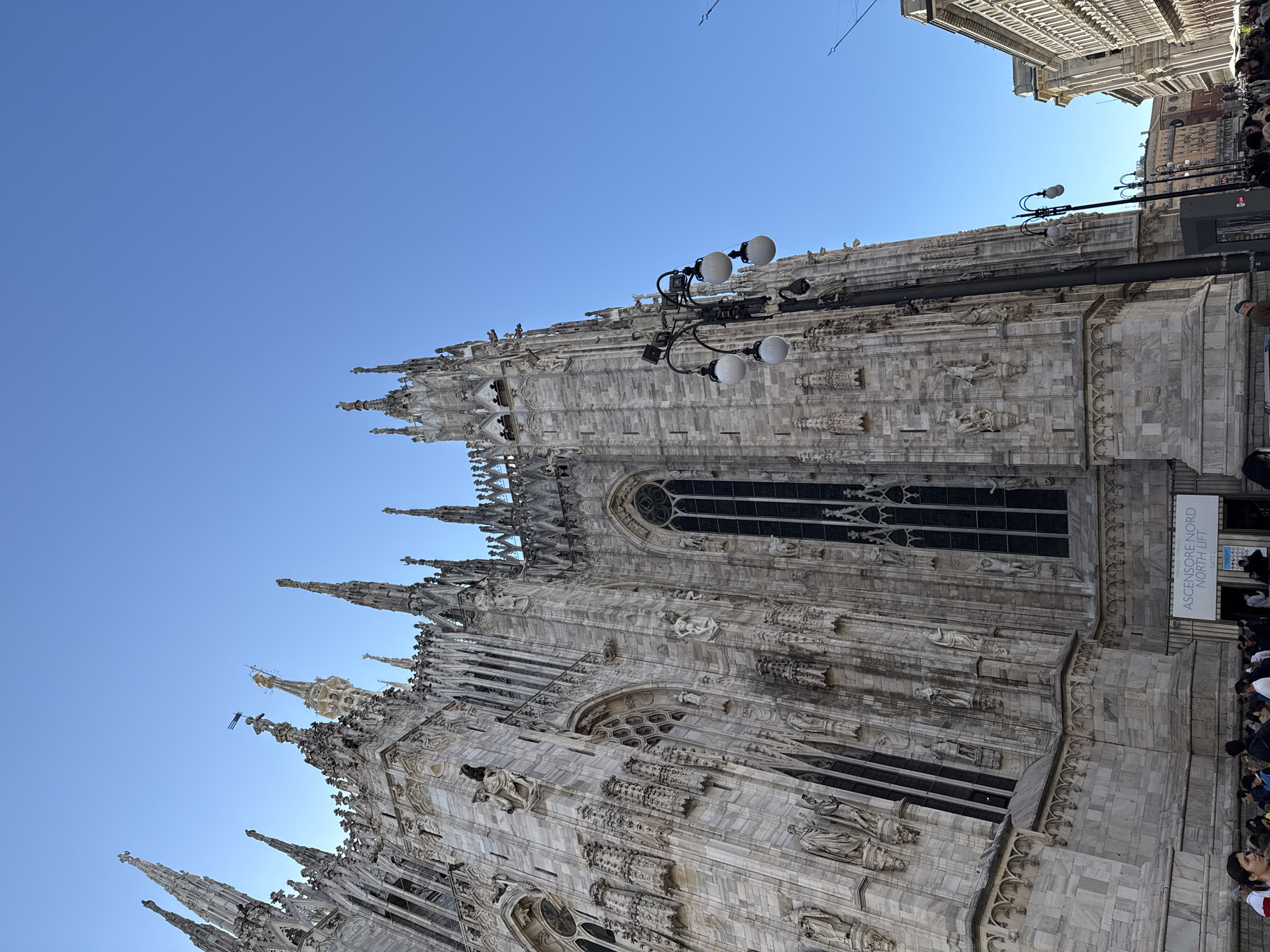 The image captures a low-angle view of the Milan Cathedral (Duomo di Milano) in Milan, Italy, under a clear, bright blue sky. The cathedral's ornate Gothic architecture dominates the left and center, showcasing its white and grey marble facade, numerous spires, pinnacles, and meticulously carved statues embedded into the walls and surrounding the large, dark-paned arched windows. A prominent multi-headed streetlamp, featuring four spherical white globes, stands in the mid-ground towards the right. At the base of the cathedral, a white sign with black text reads "ASCENSORE NORD / NORTH LIFT / GATE 2." A crowd of individuals is gathered at the cathedral's base, with their upper bodies and faces largely obscured by the camera's angle and other subjects. Distant city buildings with classical architectural styles are partially visible on the far right, extending along a street.