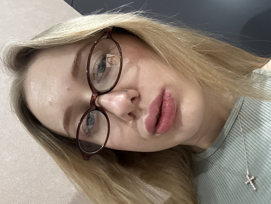 An indoor, low-angle, close-up portrait features a female individual in Azov, Russia, looking directly towards the camera. She has long blonde hair, blue eyes, and wears oval-framed glasses with reddish-brown frames. A small stud piercing is present on her left nostril. Her lips are full, colored rosy-pink, and slightly pursed. The reflection of another individual, also wearing glasses, is distinctly visible within the right lens of her eyeglasses. She is dressed in a light green, ribbed top and accessorized with a silver-colored necklace featuring a small, clear-gemmed cross pendant. The immediate background shows a light-colored, possibly textured wall on the left and a darker, uniform surface on the right.
