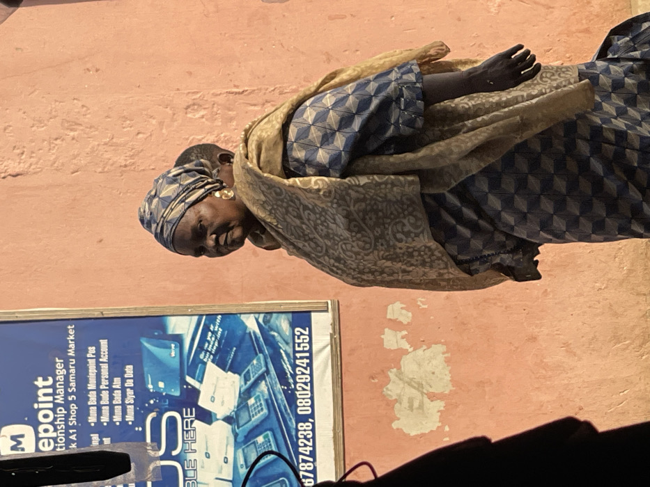 An elderly woman in patterned clothing and a headscarf stands beside an advertisement for "Mepoint," a financial services provider. The poster mentions services such as Moniepoint POS, personal accounts, ATM access, and data purchases. Contact numbers, 67874238 and 08029241552, are prominently displayed. The scene is outdoors, with a worn, painted wall in the background.