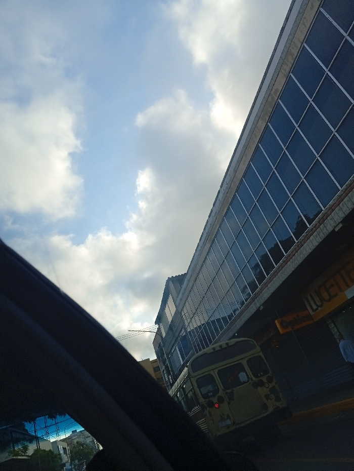 The image depicts an urban street scene during daylight in Barquisimeto, Venezuela, observed from within a vehicle. The upper third of the frame shows a partly cloudy sky with bright cumulus clouds. To the right, a multi-story building features a facade composed of numerous dark, reflective window panes arranged in a grid, topped by a light-colored concrete band. At the building's ground level, commercial signage includes a prominent yellow "LUCETTE" sign and a partial orange "Optica" sign beneath it. A weathered yellow public transport bus, with visible paint damage and grime, is positioned on the street below, facing slightly away, displaying a red circular taillight and the number "34" on its rear. One individual in a light-colored garment is partially visible on the sidewalk adjacent to the "LUCETTE" store. The bottom-left foreground reveals dark structural elements and a reflective surface consistent with a vehicle's interior. Overhead wires are visible against the sky in the mid-left. This scene is situated on a commercial thoroughfare, consistent with Avenida 20 in Barquisimeto.
