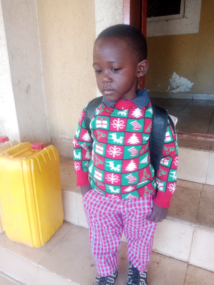 A young boy in a holiday-themed sweater and red plaid pants stands on tiled steps with a backpack. The sweater is decorated with a pattern of alternating green and red squares, featuring images of Christmas trees, reindeer, and wrapped gifts. He has his hands in his pockets and a somber expression. To his left, there are two large yellow plastic containers. The background shows a slightly aged building with a partially open doorway.