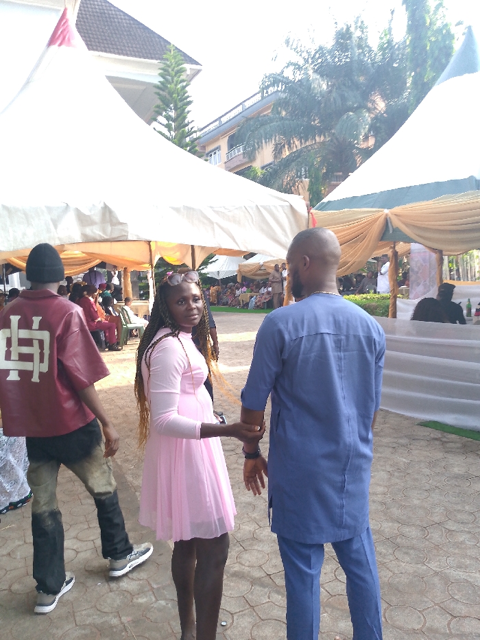 Under white canopies, a woman in a pink dress with long braids stands next to a man in a blue outfit