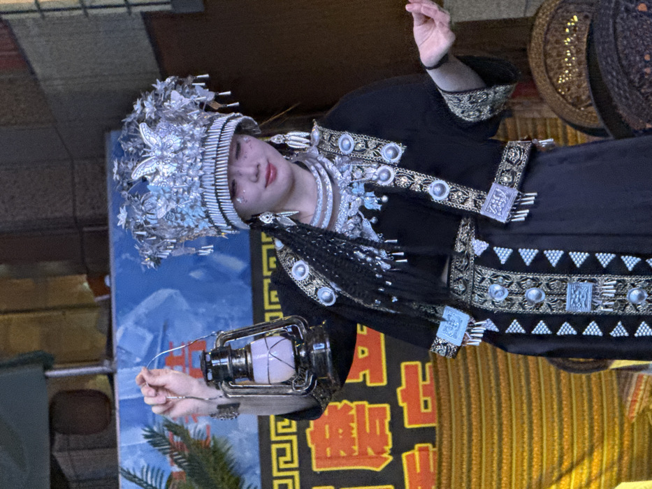 This image, captured in Yuzhong District, China, depicts a female individual in traditional attire. She is positioned centrally, holding a lit, dark-toned metal lantern with a frosted white glass globe in her raised left hand. The subject wears a black outfit comprising a short jacket and skirt, both extensively embroidered with silver and gold patterns, and adorned with large silver discs and dangling metallic ornaments. Her head is crowned with an elaborate silver headdress, featuring a prominent central butterfly motif, numerous smaller floral elements, and a base composed of silver rods. She wears multiple layered silver necklaces with light blue accents, large dangling silver earrings, and a silver bracelet on her left wrist. Her face shows a subtle smile, with glitter applied around her eyes. Her right hand is open, palm upward, in a gestural pose. The background includes a partially visible yellow banner with red Chinese characters, '磨' (mó) being clearly discernible, against a blue and gold backdrop. A dark, woven structure is partially visible on the lower right.