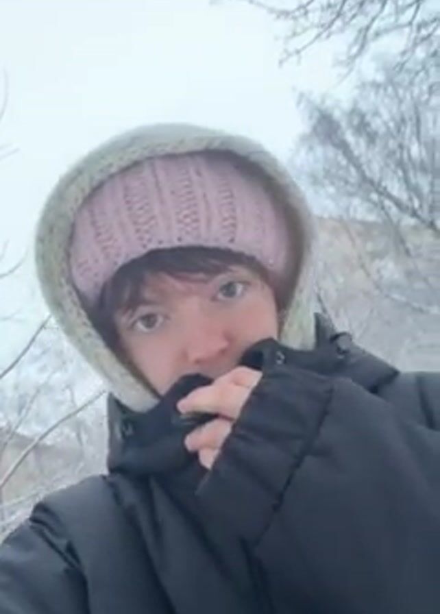 A person wearing a black winter coat and light pink knit hat, and hood is in a snowy outdoor environment. The camera pans from the person's face to reveal a snow-covered landscape with bare trees and a multi-story building in the background. The ground is completely covered in snow, and the branches of the trees are also laden with it. The building is light-colored with multiple windows. The lighting suggests a cloudy or overcast day. The person has their hand up to their face, obscuring the lower half.