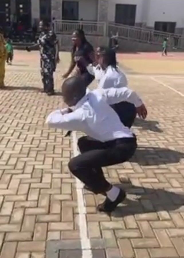 four people in what appears to be a schoolyard, participating in a game or activity. Three of them, wearing white shirts and dark pants, are crouched on the ground along a white line marked on the brick-paved surface. They are leaning forward with their hands on the ground, seemingly ready to start some kind of race. The fourth person, dressed in black, is standing behind them and appears to be encouraging them. In the background, there's a building with windows, other people walking around, and some greenery. The overall environment suggests a school or educational institution during an outdoor event or activity.