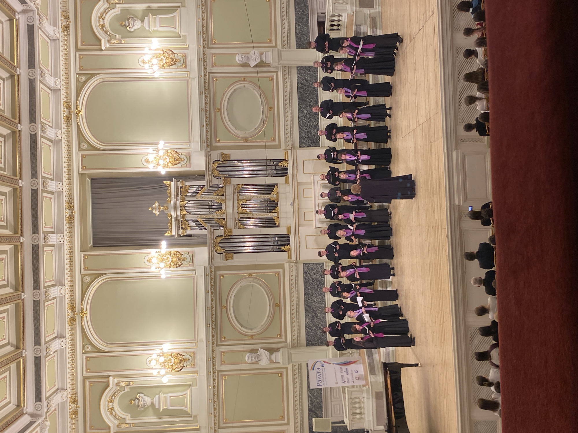 choir performance in what appears to be the Grand Hall of the Saint Petersburg Philharmonia in Saint Petersburg, Russia. The hall is ornately decorated with gold trim and architectural details. An organ is visible on the wall behind the choir. The choir members are wearing black robes with purple stoles. A piano stands to the side of the choir. An audience is seated in front of the choir, their backs to the viewer. A banner is visible next to the piano. The lighting appears to be from chandeliers.