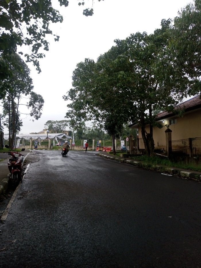 The image depicts an overcast, outdoor scene on a wet asphalt road in Chagzam_Pam, Bhutan. The road, showing reflective wetness, recedes into the distance with a slight curve to the right. On the left foreground, a red motorcycle is parked on the curb, facing away from the camera. A person on a dark motorcycle, wearing a light-colored helmet and a brown jacket, is driving away from the camera on the road, positioned in the mid-left. Further down the road, on the right side, a person in a red shirt and dark pants is jogging away from the camera. To the left, beyond the parked motorcycle, a paved driveway leads to a gated entrance. Beyond this gate, multiple white tent-like structures with pointed roofs and decorative banners are visible, suggesting an event area. Tall, slender trees with dense green foliage are prominent on the left side of the scene, reaching towards the light grey, overcast sky. On the right side of the road, a curb separates the asphalt from a strip of grass. Adjacent to this, a single-story building with a light beige facade and a dark tiled roof is visible. An outdoor light fixture is illuminated on the building's exterior. A dark metal fence runs along the front of the property. Several large trees with dense green canopies stand between the road and the building. Further along the right curb, orange traffic barriers and vertical promotional banners are present. The background shows additional distant buildings and trees under the uniform overcast sky.