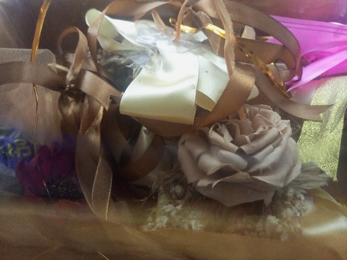 The image displays a close-up, still-life arrangement of decorative items. A prominent light brown fabric rose with layered petals is positioned in the lower right foreground, resting on a bed of small, dried, light-colored botanical elements. Numerous brown satin ribbons are draped and tied into bows throughout the composition, intermingling with cream-colored satin ribbons and delicate golden wire accents. A translucent, light brown mesh fabric partially covers the scene. To the left, a portion of a purple and blue patterned decorative item is visible. In the background, sections of bright pink and golden textured fabric are present. No individuals, actions, or specific environmental identifiers for the city of Zee Pin Kone, Myanmar, are depicted within the frame.
